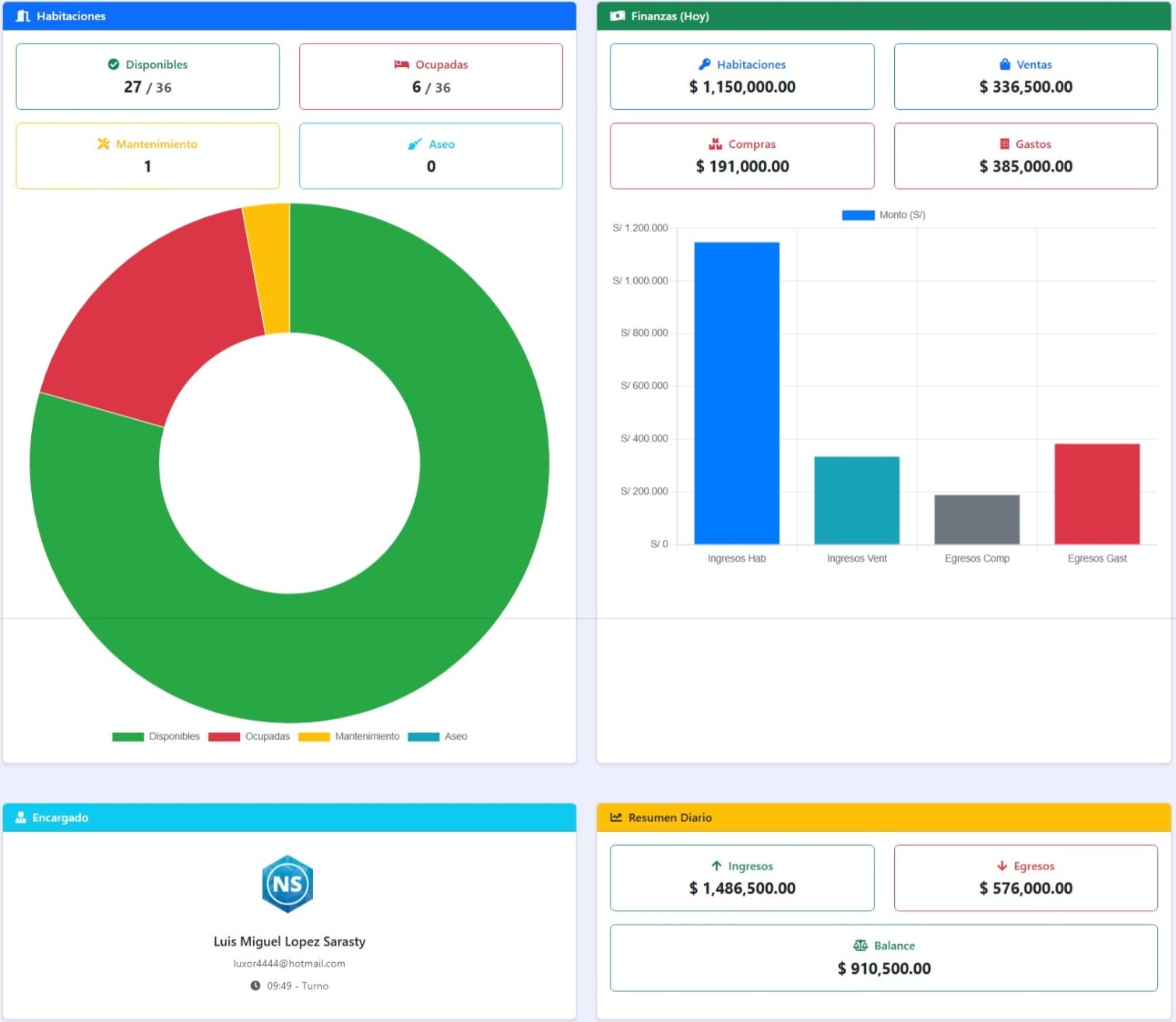 Con el plan básico de ClinkBook, accedes a un panel inteligente que concentra toda la información financiera de tu hotel en tiempo real. ¿La ocupación de hoy? Ahí está. ¿Cómo va el mes? También. Desde ingresos por habitaciones y servicios hasta egresos operativos, este dashboard te permite entender el estado económico del negocio con solo unos clics.